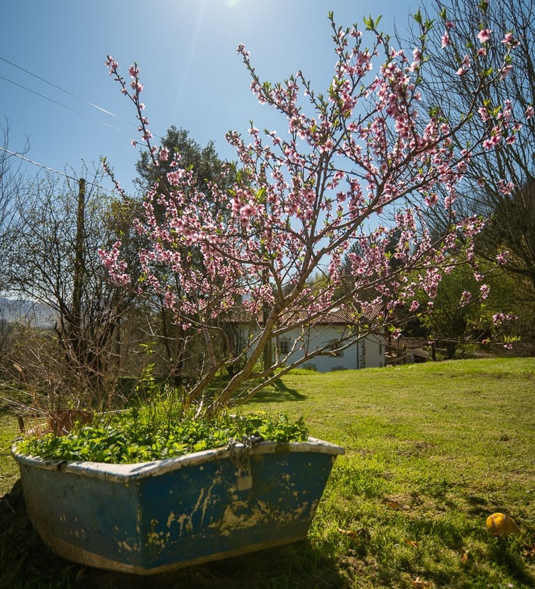Disfruta de la paz en nuestro jardín junto al caserío o relájate en plena huerta. Un espacio diseñado para desconectar al sol, rodeado de verde y con la tranquilidad absoluta de nuestro entorno rural.
